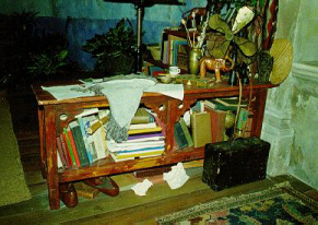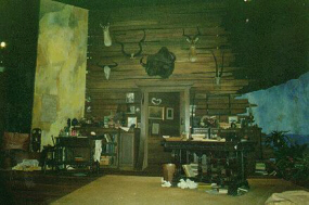 It's hard to see here that the slatted wall with the buffalo on it curves down at the bottom. By the time Santo and Maggie Kuypers, prop goddess, were done we could hardly find our scenery.